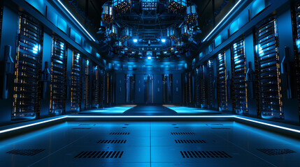 High - Tech Data Center, Virtual Servers, Light Streaks, Symbol - Moving Path for Big Data Processing in Futuristic Film.
