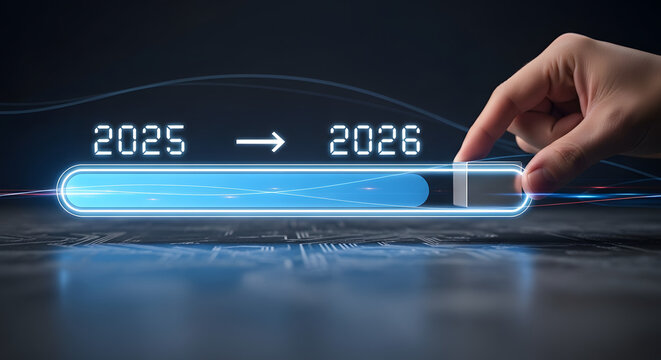 Loading bar with wooden blocks showing progress from 2025 to 2026 on a blue background with hand