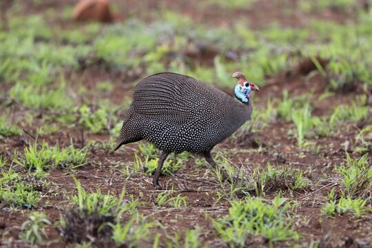 Helmeted Guineafowl (Numida meleagris), adult, running, Kruger National Park, South Africa