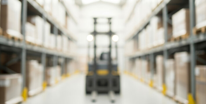 Forklift truck moving through warehouse aisle surrounded by tall shelves stacked with brown boxes and industrial goods, blurred background showing depth and warm lighting.