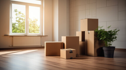 A room in a house with sunlight streaming through the window, illuminating a stack of cardboard boxes, suggesting a process of moving or relocation