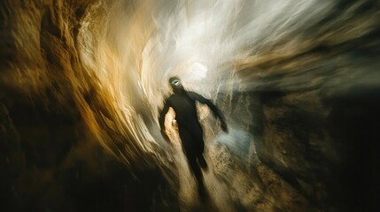 A blurry person moving through an illuminated dark cavernous space