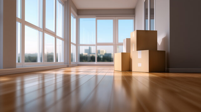 Cardboard moving boxes stacked in bright empty apartment with city view through windows.