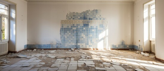 The room is cluttered with broken tiles scattered across the floor, indicating a need for repair or renovation. The empty space suggests ongoing work,