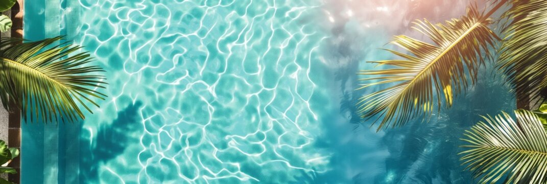 An inviting view of a swimming pool with crystal clear blue water, framed by shadows of palm leaves gently moving in the sunlight.