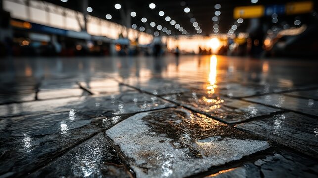 Urban train station at night, vibrant colors, tiled floor