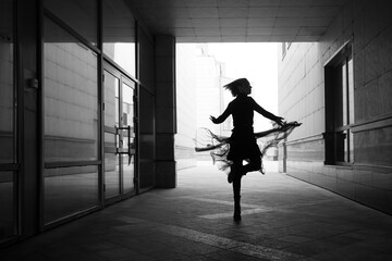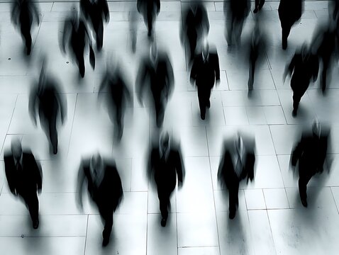 Blurred monochrome photo of moving people in dark business suits