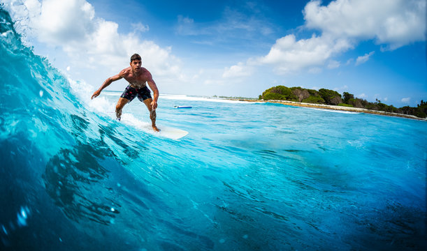 Young athletic surfer rides the ocean wave on Sultans surf spot in Maldives