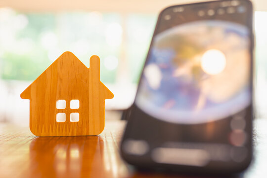 House symbol on table with mobile phone opening world map concept of housing or moving abroad