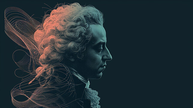 Exposure portrait of Wolfgang Amadeus Mozart combined with abstract lines and curves.