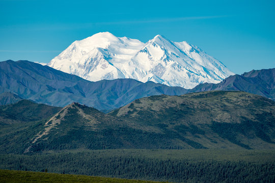 Denali National Park with the mountain (previously named Mt McKinley) in full view, with blue skies and forest wilderness in foreground