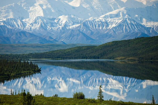The massive rise of Mt. McKinley and the Alaska Range reflect on mirror-like Wonder Lake.