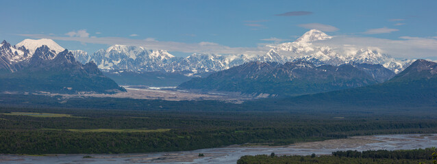 Stunning panorama of the tallest mountain in North America Denali (Mt Mckinley), Mt Foraker, and Mt Hunter.