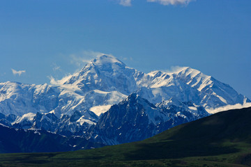 Denali in the alaska range.  Denali is the highest mountain peak in North America, with a summit elevation of 20,310 feet