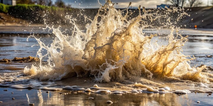 Water explodes from a burst pipe on the ground causing a muddy splash and waves moving rapidly outward