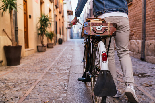 Cropped image of man in denim jacket pushing his vintage classic bicycle through the alleys of the city. Seen from behind.