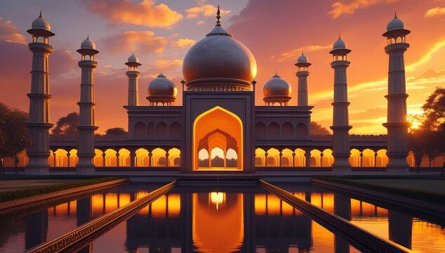 Watercolor painting of an ornate archway framing a tranquil courtyard with a reflecting pool and Mughal architecture