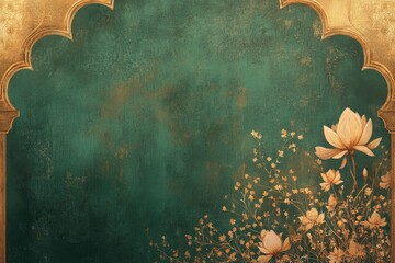 Illustration of a Mughal garden arch with plants and peacocks designed in a traditional Islamic vector pattern for invitations