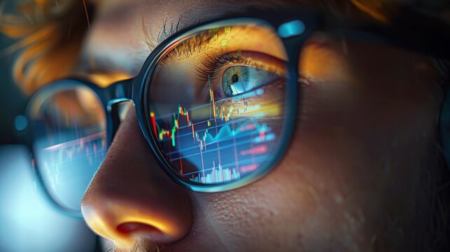 Close up of an individual wearing glasses, through which the reflection of a computer screen displaying a stock market chart is visible. analysis of market trends and data. Generative AI.