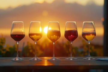 A group of wine glasses with different colored liquid in them. AI.