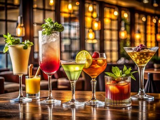 Variety of alcoholic drinks and multi colored cocktails on the reflective surface of bar counter. Blurred shelves with bottles on background