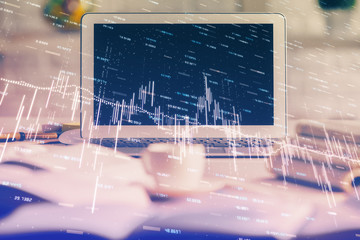 Financial graph colorful drawing and table with computer on background. Multi exposure. Concept of international markets.