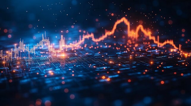 Glowing line graph with orange and blue lights represents data or financial trends on a dark digital background