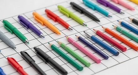 Colorful Pens and Pencils Arranged on Graph Paper Creative Tools for Writing and Drawing Projects