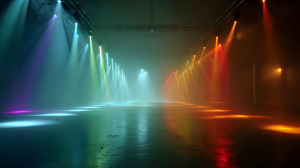 Illuminated space with multi colored spotlights, casting beams in foggy warehouse atmosphere