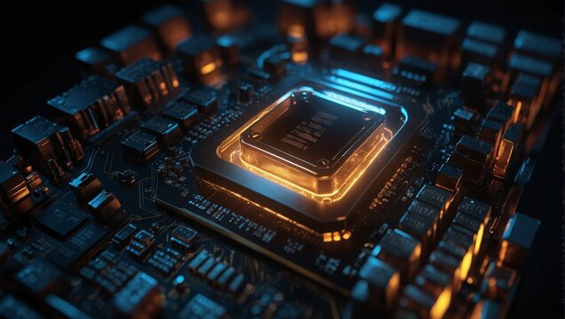 Computer Technology: Close up of a computer chip on a circuit board. Light effect.