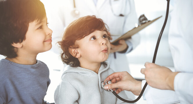Doctor-woman examining a child patient by stethoscope in sunny clinik. Cute arab boy and his brother at physician appointment