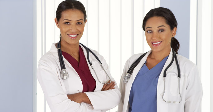 Smiling portrait female Caucasian nurse with multi ethnic team in medical centre
