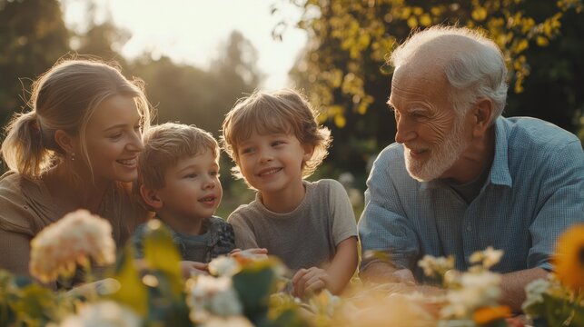 A multi-generational family gathers in a sunlit garden, enjoying an afternoon picnic, with grandparents sharing stories as children play nearby.