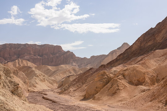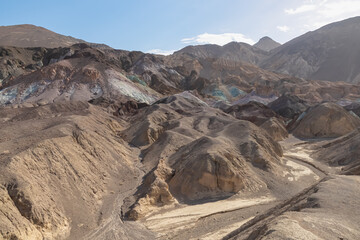 Scenic view of colorful geology of multi hued Amargosa Chaos rock formations in Death Valley National Park, Furnace Creek, California, USA. Barren desert landscape of Artist Palette in Black mountains