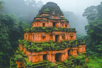 Aerial misty view over dense vibrant green rainforest canopy