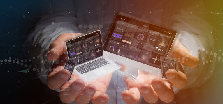 Businessman holding Devices connected to a cloud multimedia network 3d rendering