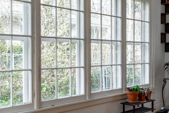 Framing snowy stems through frosted multi-pane window with delicate ice crystals