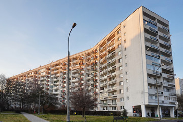 A large apartment building from the Soviet Union in a residential area on Sunny, clear day at sunset. Soft light on the upper floors of a house.