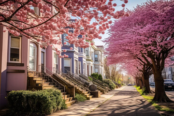 A charming street adorned with blooming cherry blossoms in spring, creating a picturesque scene of natural beauty and seasonal renewal.