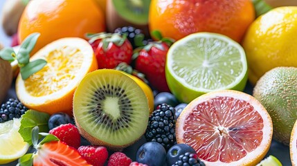 Colorful selection of fresh berries, citrus fruits, and tropical fruits, highlighting a healthy diet