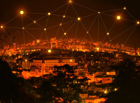 Aerial View of a City at Night with Illuminated Buildings and a Network of Lines Connecting Them, Showing the Concept of Connected Cities