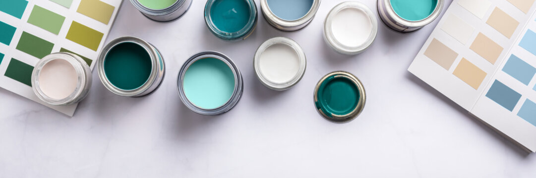 Tiny sample paint cans during house renovation, process of choosing paint for the walls, different blue, green and white colors, color charts on background, banner size