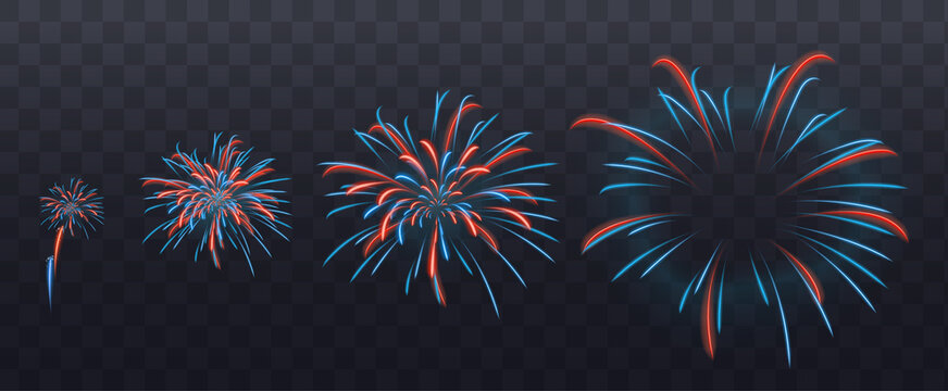 Realistic shiny colorful fireworks composition on transparent background