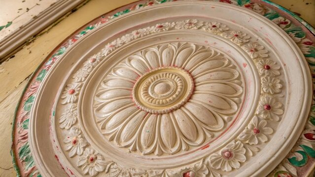 A zoomedin perspective of a vintage ceiling medallion depicting a finely crafted rosette pattern with paint drying slowly around its edges.