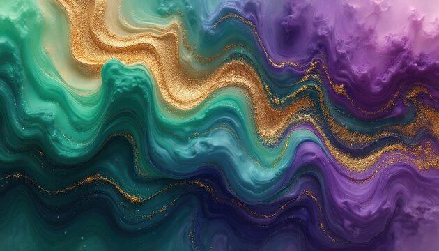 Abstract fluid art merges vibrant purple green and gold colors. Liquid paint swirls create dynamic waves forming a rich textured background for creative projects and designs.