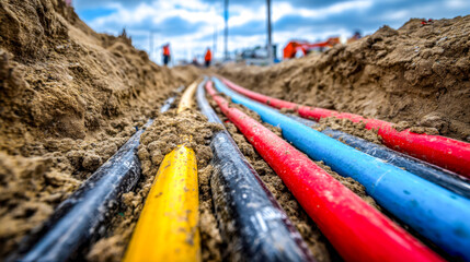 Color-coded underground utility cables installation on a construction site