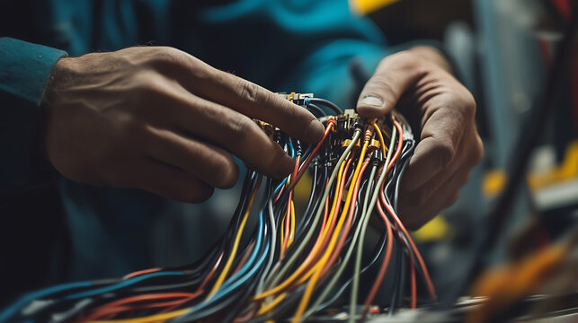 Abstract background of a tangled mass of multicolored electrical wires and cables