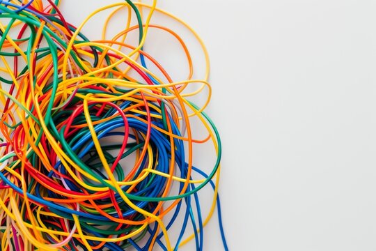 A close-up view of a vibrant coil of red, blue, and yellow electrical wires, showcasing the exposed copper strands and colorful plastic insulation, essential for power transmission and connectivity.