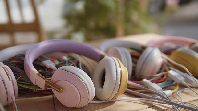 A creative workspace displaying a variety of colorful headphones, chargers, and cables intertwined, reflecting a lively atmosphere that inspires creativity and modern connectivity. cinematic color