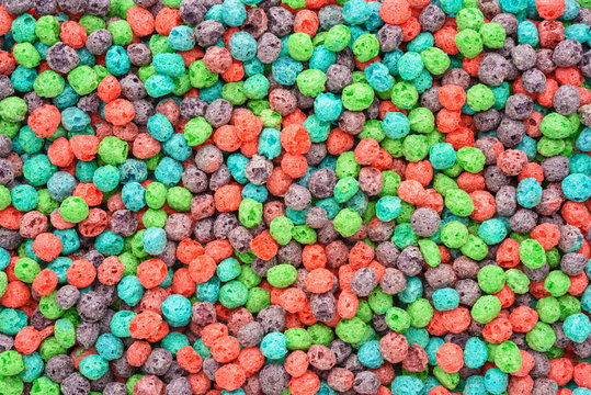 Background of round colorful cereal. Colorful breakfast food. Colorful cereal loop rings.